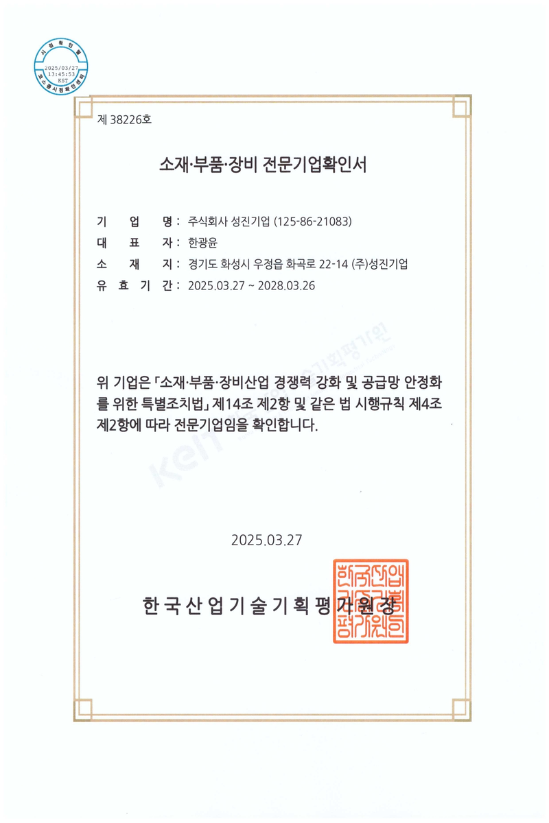 - 2025년 소재 · 부품 · 장비 전문기업확인서 획득